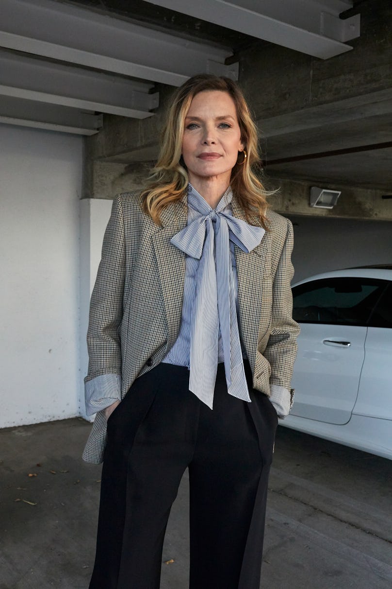 Michelle Pfeiffer wears a Celine by Hedi Slimane jacket and blouse; Hermès pants; Cartier earrings.