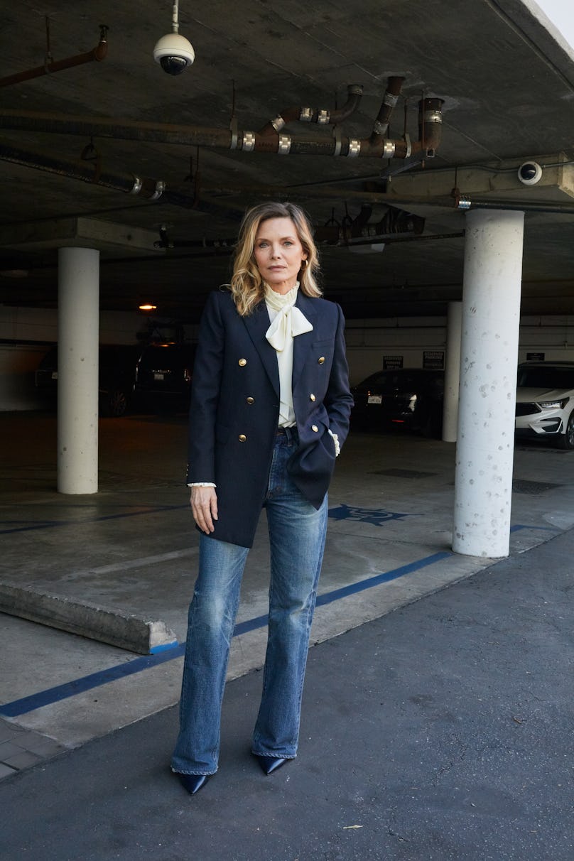 Pfeiffer wears a Saint Laurent by Anthony Vaccarello blazer and blouse; Celine by Hedi Slimane jeans; Cartier earrings; Jimmy Choo shoes. Hair by Richard Marin for Oribe; makeup by Brigette Reiss-Andersen for Armani Beauty at A-Frame; sittings editor: Samantha McMillen.