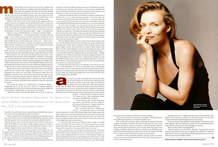 Now 38, michelle Pfeiffer has been on the A-list for the past eight years, ever since The Witches Of Eastwick diverted her from a series of blonde arm ornaments into a broad range of characters. There could have been an even greater gallery had she not turned down the leads in Basic Instinct, The Silence Of The Lambs, Sleepless In Seattle and Disclosure, but then, as she admits, she’s not a very good judge of scripts. A native of Orange County—a sort of wealthy beach ‘burb wedged between LA and San Diego—Pfeiffer originally went to college to study court journalism, ringing up the tills in her local supermarket to pay her way, when a friend of hers entered her in the annual Miss Orange County contest. A tad miffed, Pfeiffer gave it a whirl on the off-chance of some exposure to pursue her secret desire, acting. She duly won and the rest, as they say, is history.