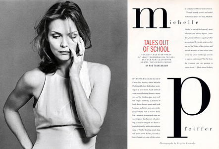 Though armed guards and unfed Dobermans aren’t her style, Michelle Pfeiffer is one of Hollywood’s most reluctant and uneasy figures. These days, most celebrities eagerly proffer an emotional X-ray; ask an actress her age and she’ll take off her clothes, and it’s only a matter of time before some savvy star opens his therapy sessions to a press conference (“Hi, I’m from the Enquirer, and my question is for the shrink”). Think about Pfeiffer’s peers, and your first associations will likely be their public renown, whether it’s Demi Moore turning each pregnancy into a photo spread or the romantic-disaster movies lived out by Julia Roberts and Sharon Stone. With Pfeiffer, you think of her work, partly because it’s excellent, partly because you know little about her.
