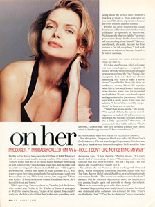 Says Jack Nicholson: “You never could steamroll Michelle. She’s always very tough in that sense.” Toward that end, she’s got a production deal with Disney to develop films. She’s already been “producing by default,” she says, because she can get a film approved just by committing to appear in it. “I really enjoy the process of producing: figuring out the best crew and the best writer for a particular project.”