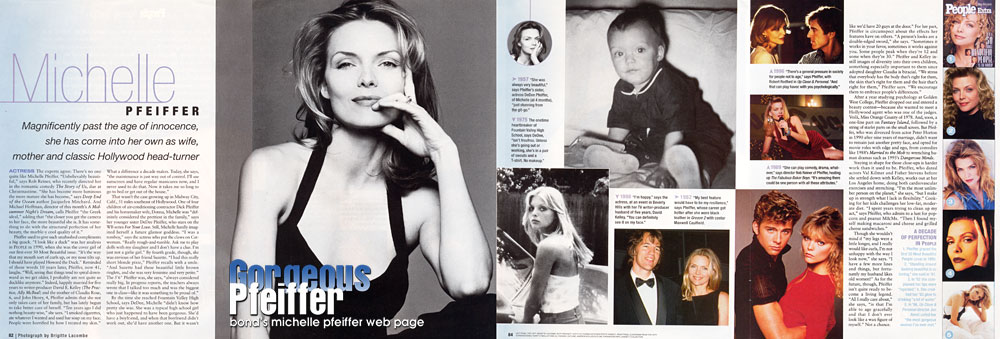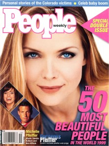 1. Pfeiffer graced the first 50 most beautiful People cover in 1990. 2. “Standing around looking beautiful is so boring, “She said in ’91. 3. In ’92 she complained her lips were “lopsided.” 4. She credited her ’93 glow to drinking “a lot of water.” 5. In ’96, Up Close & Personal director Jon Avnet called her “the most gorgeous woman I’ve ever met.”